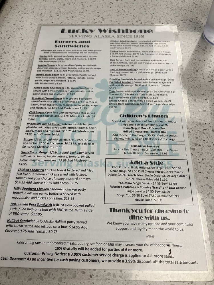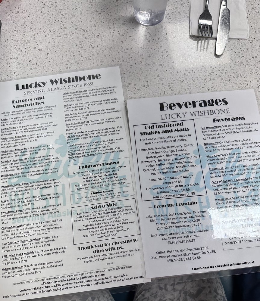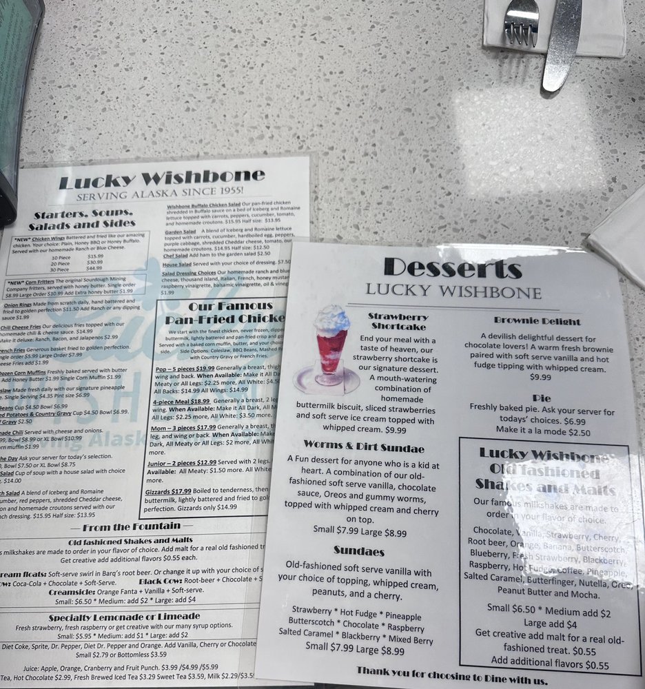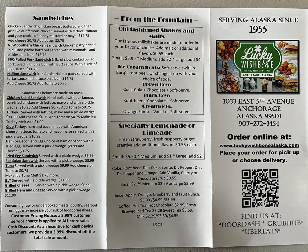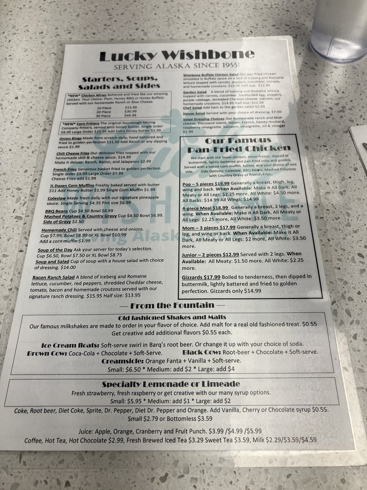 Introducing Lucky Wishbone, a local favorite in Anchorage offering a diverse menu of burgers, chicken, sandwiches, soups, salads, and sides. This casual yet vibrant spot is known for its flavorful pan-fried chicken and jumbo burgers served with all the fixings. The atmosphere is welcoming and perfect for groups or a family outing. Customers rave about the excellent service and affordable prices. Don't miss out on their homemade chili or daily soup specials. With options for vegetarians and plenty of seating including outdoor dining, Lucky Wishbone caters to every diner's needs. Whether you're craving a classic burger or a comforting bowl of soup, this eatery delivers on taste and value. Experience the warmth and charm of Lucky Wishbone for a satisfying meal in Anchorage.